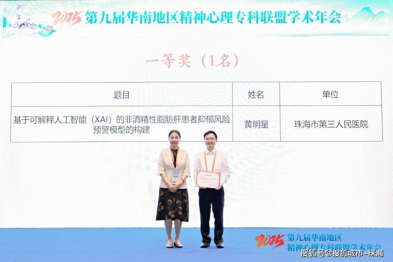 黄明星院长团队提交的《基于可解释人工智能(XAL)的非酒精性脂肪肝患者抑郁风险预警模型的构建》荣获一等奖。论文研究揭示代谢-炎症-行为多维风险机制。该研究成果可通过常规指标(血液生化、人体测量等)快速评估风险,为提升治疗依从性监测和心脑血管共病管 善MAFLD患者全周期预后提供循证支持。这一荣誉不仅体现了我院在精神卫生领域的学术实力,更彰显了医院临床与科研紧密结合的创新发展模式。评审委员会特别指出:"该成果实现了从机制探究到临床转化的完整闭环,具有显著的公共卫生价值。"
