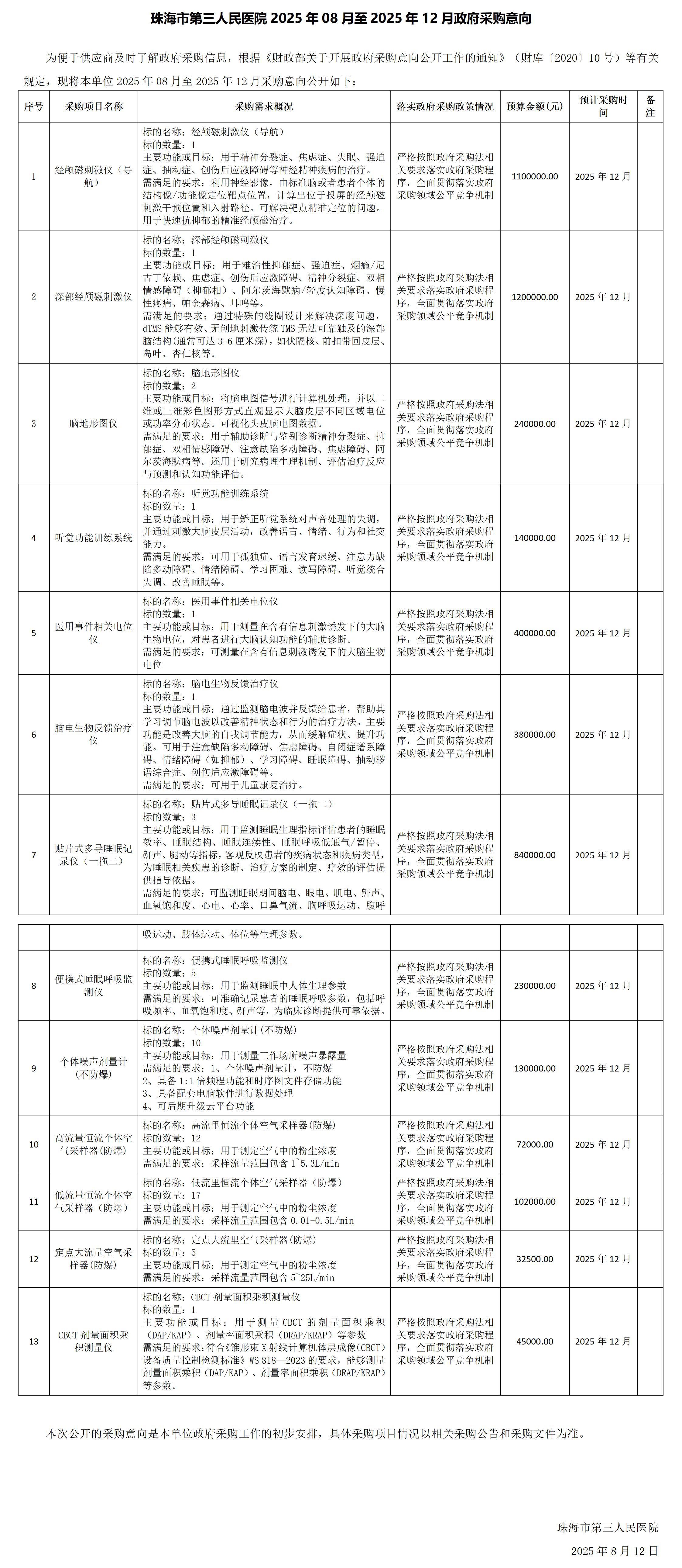 珠海市第三人民医院2025年08月至2025年12月政府采购意向